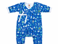 Ideal gift for winter warmth. Two layered snuggle suit in 100% cotton jersey. Blue outer layer with white jersey lining. White tie at side. Machine washable.