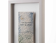 The ceramic tiles, which are textured with wallpaper patterns are formed from flat pieces of clay framed in white wooden frames made here in Dundalk.