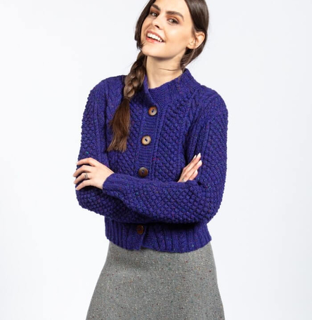 The shorter merino Eve is a sporty cardigan Handknit in Ireland at our studio from a luxury merino wool and mohair blend spun locally. It features the trademark aran blackberry stitch of the Donegal region, with large wishbone cables and Irish moss.A lightweight Aran alternative that has a very handknit character. It is true that the blackberry stitch cannot be machine knit.