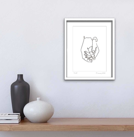 The holding of hands is a powerful expression in our society. From early childhood and holding the hand of a caregiver to adulthood and the romantic expression of love, it an essential symbol of togetherness. The complex interweaving line of this piece aims to capture how we become intertwined when we love.