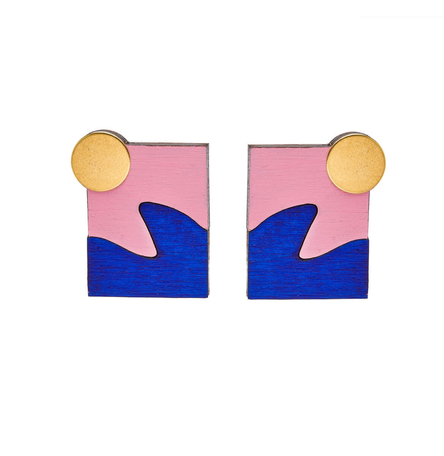 New Wave earrings in handpainted lasercut birchwood ply and with a brass circle. Brand new design for 2021 to usher in a new era! Design is based on an ocean wave at sunset. Colours may vary slightly to photograph due to texture of wood. Earrings use a stainless steel ear pin.